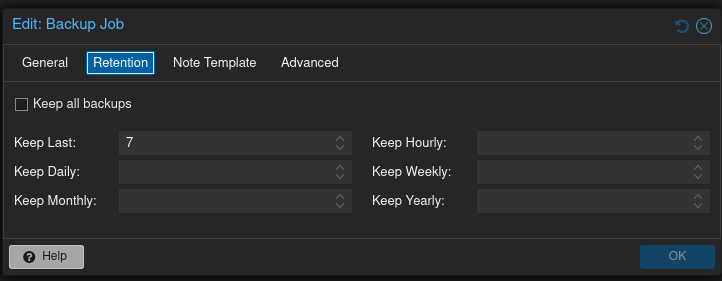 - Selection Mode: Either select all or manually choose which VMs and LXCs to run backup for